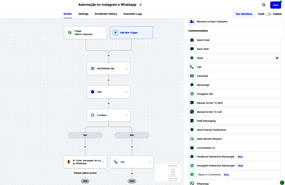 Feito para quem não conhece nada de tecnologia, você pode criar fluxos de comunicações poderosos com poucos cliques, conectando suas páginas, e-mails, Direct do Instagram, WhatsApp e CRM — tudo em um único sistema.